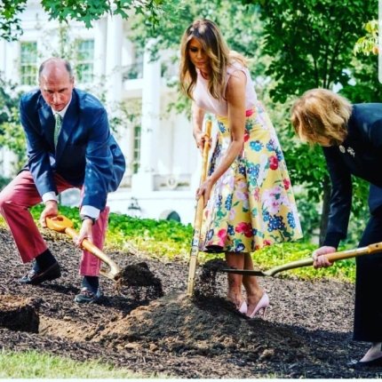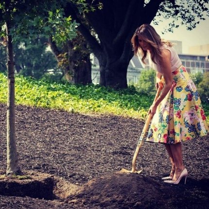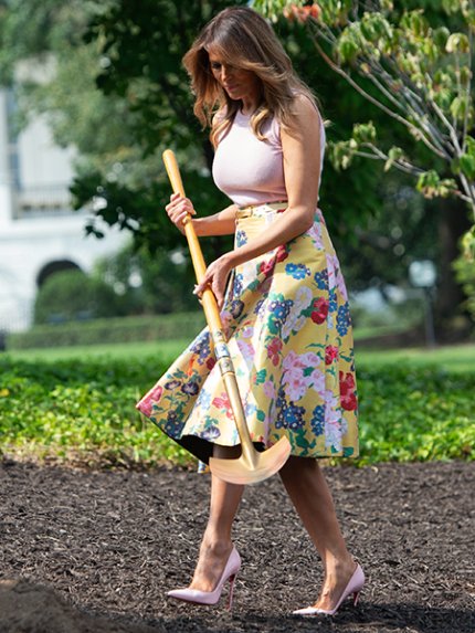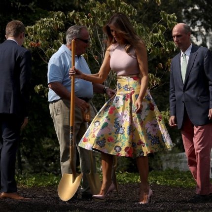 На кадрах показано, что в отличие от своей предшественницы Мишель Обамы, Мелания Трамп для работы в огороде не стала надевать резиновые сапоги и невзрачную одежду. Она появилась там в яркой юбке и нежно-розовых туфлях на высоких каблуках. В этом наряде первая леди США взяла в руки лопату и приняла участие в пересадке дуба бывшего президента Дуайта Эйзенхауэра.