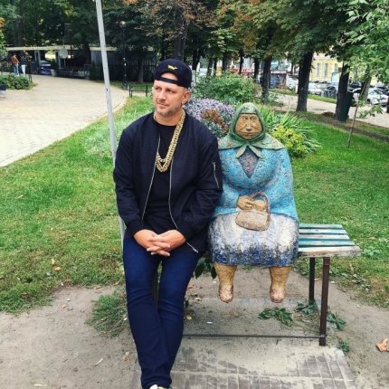 Украинский рэпер и продюсер Алексей Потапенко (Потап) показал фото, на котором позирует сидя на необычном киевском памятнике "Бабушка классическая".