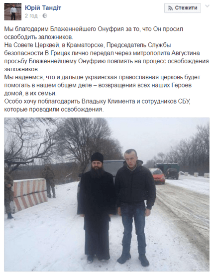 По словам Тандита, глава СБУ Василий Грицак на Совете Церквей в Краматорске попросил митрополита Августина передать Митрополиту Онуфрию просьбу повлиять на процесс освобождения заложников из плена боевиков.