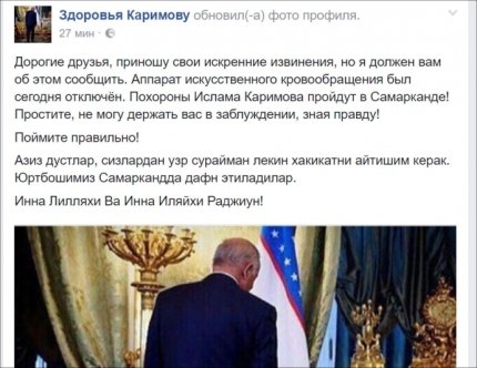 Тем временем в группе "Здоровья Каримову" в Facebook появилась запись администратора группы о том, что "аппарат искусственного кровообращения был отключен сегодня".