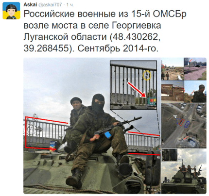Так, в сети появились найденные в соцсетях фотографии военных 15-й отдельной мотострелковой бригады РФ, по которым с помощью меток местоположения, а также определенных признаков местности удалось определить, что они были сняты у населенного пункта Георгиевка Луганской области в сентябре 2014 года.