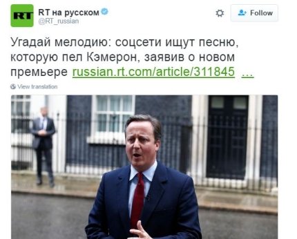 Кэмерон заявил журналистам, что направляется в Букингемский дворец подавать заявление, после чего развернулся и пошёл к двери. При этом британский премьер очевидно забыл, что микрофон на нём ещё не выключен и начал напевать песню, а уже зайдя во дворец произнёс: «Да. Хорошо».