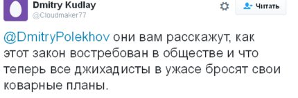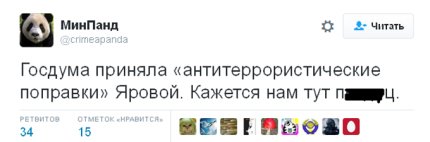 В социальных сетях бурно отреагировали на принятие Госдумой России пакета "антитеррористических законов", предложенных депутатом Ириной Яровой и сенатором Виктором Озеровым.