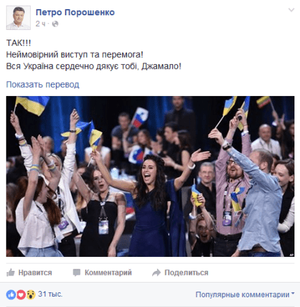 Президент Украины Петр Порошенко поздравил Джамалу с победой на Евровидении-2016.