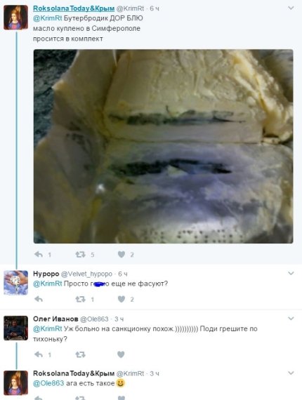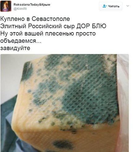 RoksolanaToday&Крым: "Куплено в Севастополе Элитный Российский сыр ДОР БЛЮ Ну этой вашей плесенью просто объедаемся... завидуйте".