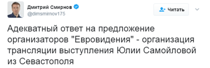 В ответ на предложение Европейского вещательного союза об организации выступления представительницы России Юлии Самойловой на Евровидении через спутниковую трансляцию журналист кремлевского пула Дмитрий Смирнов попытался пошутить и предложил устроить ее выступление в оккупированном Севастополе.