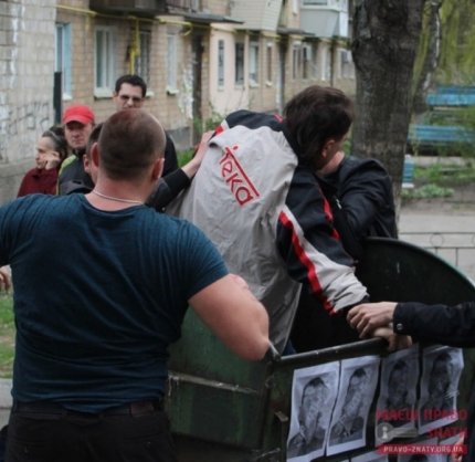 Активисты ВО "Свобода" и представители ВОО "Сокол" выбросили в мусорный бак главу земельной комиссии горсовета Броваров, бывшего "свободовца" Василия Кочубея.