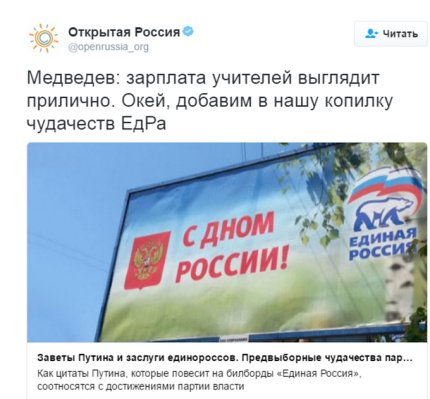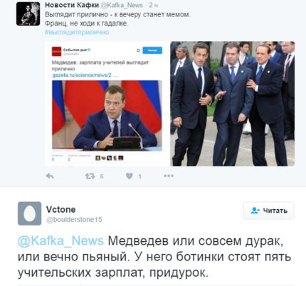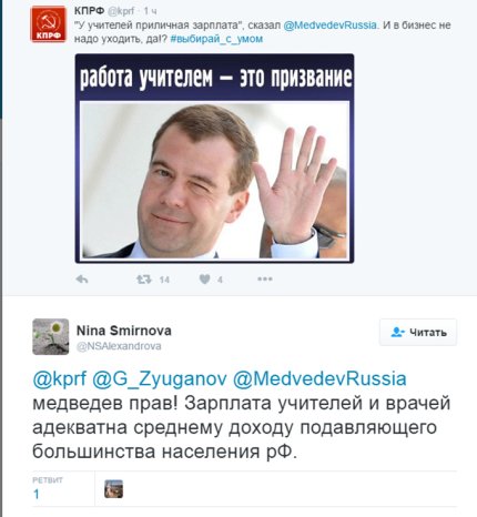 «Медведев заявил, что российские учителя в общем и целом – капризные богачи, постоянно требующие повышения и без того гигантской зарплаты», - написал пользователь Twitter Владимир Терехов.