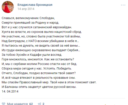 СМИ отмечает, что еще в 2014 году Броницкая была активной участницей пророссийских митингов, давала интервью российским телеканалам про "бандеровцев в Харькове" и писала стихи о "сатанинском Евромайдане" и "нацистском сброде".