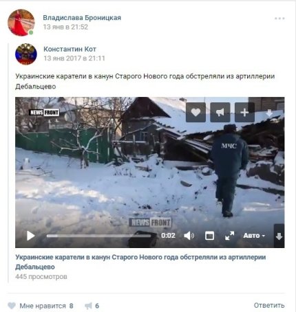 Только за 13 января 2017 года на ее странице опубликованы два материала с обвинениями "укрокарателей": в обстреле Дебальцево, а также о якобы в убийстве и изнасиловании девушки из Красногоровки.