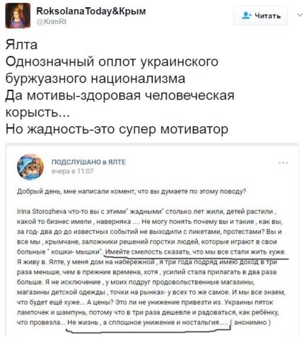 "Имейте смелость сказать, что мы все стали жить хуже. Я живу в Ялте, у меня дом на набережной, я три года подряд имею доход в три раза меньше, чем в прежние времена, хотя, усилий стала прилагать в два раза больше. Я не исключение, у моих подруг продовольственные магазины, магазины детской одежды, точки на рынках – у всех то же самое. И мы все знаем, что будет еще хуже. А Цены? Это ли не унижение привезти из Украины пяток лампочек и шампунь, потому что в три раза дешевле и радоваться, как ребенку, что привезла…Не жизнь, а сплошное унижение и ностальгия", - написала жительница Ялты в одном из крымских пабликов.