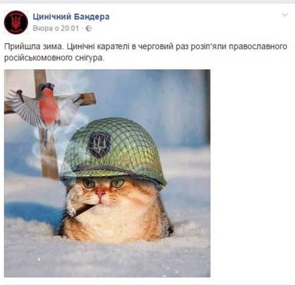 "Пришла зима. Циничные каратели в очередной раз распяли православного русскоязычного снегиря", - написал Цинічний Бандера.