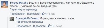 В сети посочувствовали Бабченко, и предложили ему возможные варианты того, как расслабиться. Так, Сергей Матско написал: "Все, он у Вас в подсознании... Как изгонять будете его теперь... (много не пейте, вредно))"