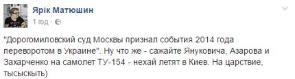 Так, известный блогер Ярослав Матюшин: "Ну что же - сажайте Януковича, Азарова и Захарченко на самолет ТУ-154 - нехай летят в Киев. На царствие, тысыскыть)".