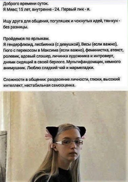 «Я Мявс; 15 лет; внутренне — 24. Первый пик — я. Ищу друга для общения, погуляшек и чокнутых идей, тян-кун — без разницы. Пройдемся по ярлыкам. Я гендерфлюид, лесбиянка (с девушкой), Весы (если важно), Гюго с перекосом в Максима (если важно), феминистка, атеист, ролевик, адовый слэшер, личинка художника и интроверт, днями сидящий в своей берлоге. Мультифандомщик, немного анимушник. Люблю сладкий чай и мармеладки», — гласил пост.