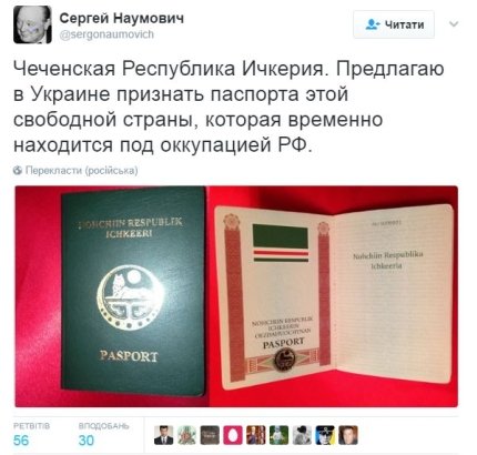 Так, блогер Сергей Наумович на своей странице в Twitter написал: "Чеченская Республика Ичкерия. Предлагаю в Украине признать паспорта этой свободной страны, которая временно находится под оккупацией РФ".