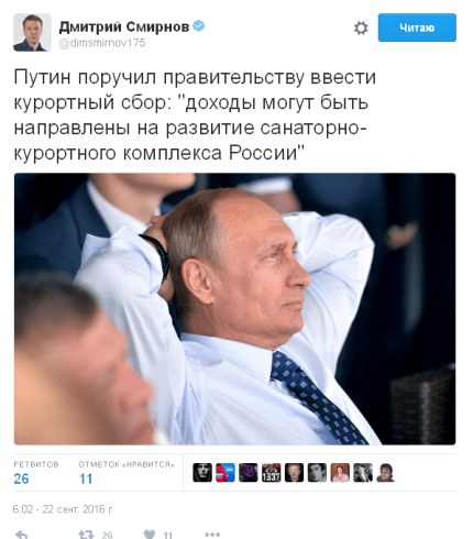 «Путин поручил правительству ввести курортный сбор: "доходы могут быть направлены на развитие санаторно-курортного комплекса России", — сообщил журналист.
