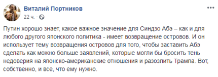 По мнению публициста, Путин рассчитывает на то, что президент США не будет вникать и детально разбираться в сути вопроса, а будет руководствоваться только тем, что "увидит в телевизоре". Если план Кремля не сработает, то Путин продолжит переговоры с Абэ, пока не достигнет цели задуманного.