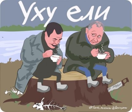 На картинке изображены Путин и Медведев, которые, сидя на пне, едят уху.