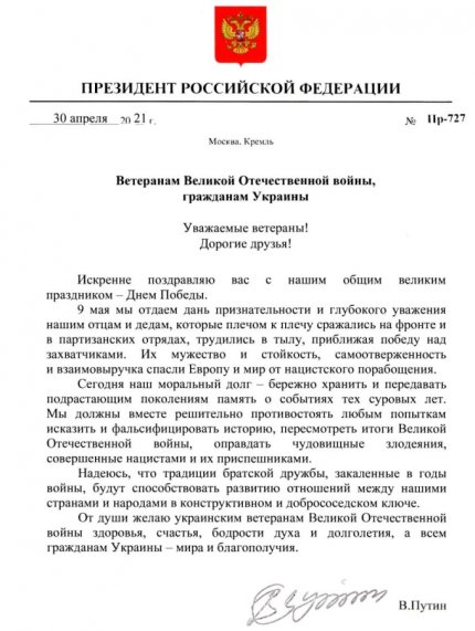 Президент Российской Федерации Владимир Путин поздравил с Днем победы над нацизмом лидеров стран, входивших в состав СССР. В нем он, как и в прошлом году, проигнорировал президента Украины Владимира Зеленского - послание адресовано только украинскому народу.