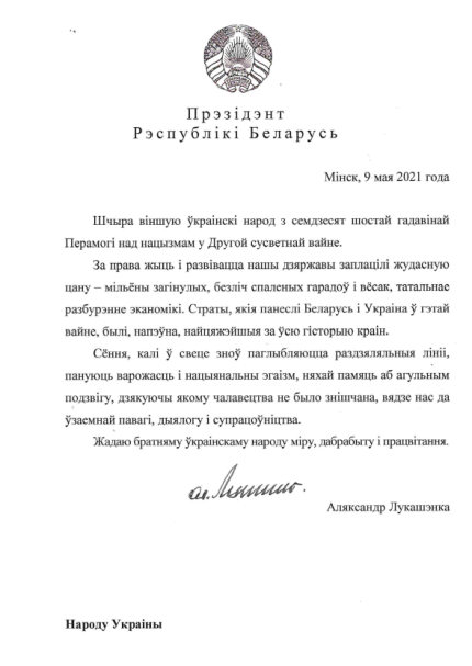 Он отметил, что потери Беларуси и Украины в той войне были "самыми тяжелыми за всю историю стран". Лукашенко пожелал "братскому украинскому народу" мира, благосостояния и процветания.