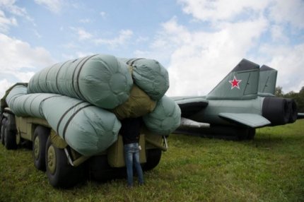 В солнечном поле за пределами Москвы сдутая матерчатая копия ракетной системы С-300 - в металлической версии, один из самых страшных видов оружия в России, - выглядит как большая, неубранная постель с одеялом камуфляжной расцветки.