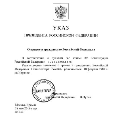 Соответствующий указ №323 о приеме Нойштедтера в гражданство Российской Федерации опубликован 25 мая.