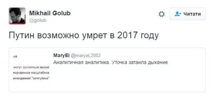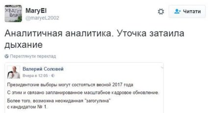 Так, один из пользователей написал: "Аналитичная аналитика. Уточка затаила дыхание". Отметим, что под "уточкой" имеется ввиду Дмитрий Медведев, вокруг тайной дачи которого ранее возник скандал. На 80 гектарах земли, где построена его дача, кроме всего прочего, есть "дом для уточки".