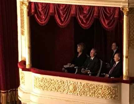 В театре президента РФ встретили гендиректор театра Тамара Михайлова, художественный руководитель Юрий Соломин, а также министр культуры Владимир Мединский.
