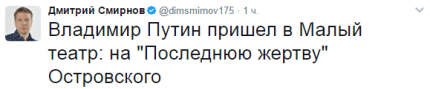 "Владимир Путин пришел в Малый театр: на "Последнюю жертву" Островского", - написал он.
