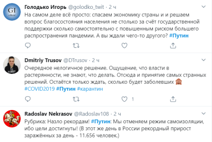 "В общем ничего нового, издевательства над народом продолжаются", "Как речь может быть настолько продолжительной и бессмысленной. Кто-то по 3 тысячи получит, кто-то по 5, а кто-то вообще ничего", "Он снова подтвердил, что главная задача российского государства в том, чтобы сделать человеческую жизнь невыносимой", "Ну хоть карантин необъявленный отменил", Какая чушь, как всегда пыль в глаза, а поделу и о помощи населению ни слова", "Все это вранье", - комментируют экстренное обращение Путина простые россияне.