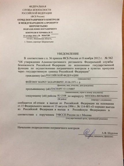 Напомним, что в августе Фейгину уже ограничивали выезд из России из-за пианино, которое он якобы не вернул бывшей жене при разделе имущества. Однако позже ФСБ сняла запрет. С чем связан нынешний запрет, в ФСБ пока не объясняют.