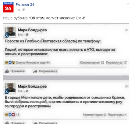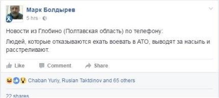 По его словам, "началось всё с того, что один пациент самой большой психушки на планете запостил: "Новости из Глобино (Полтавская область) по телефону: Людей, которые отказываются ехать воевать в АТО, выводят за насыпь и расстреливают".