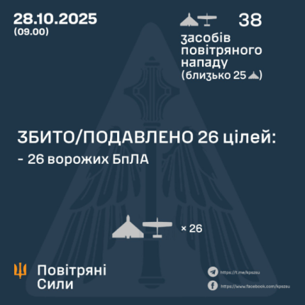 Согласно данным Воздушных сил ВСУ, в течение ночи 27-28 октября российские захватчики совершали атаку 38 ударными БпЛА типа Shahed, Гербера и беспилотниками других типов. Силы ПВО смогли успешно отразить новое нападение врага.