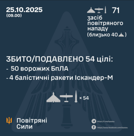 В течение ночи 24-25 октября российские оккупанты совершали атаку девятью баллистическими ракетами Искандер-М, 62 ударными БпЛА типа Shahed, Гербера и беспилотниками других типов. Силы ПВО смогли обезвредить большинство вражеских целей.