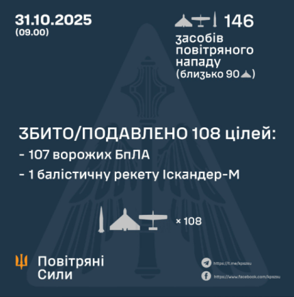 В течение ночи 30-31 октября российские захватчики совершали воздушное нападение на Украину одной баллистической ракетой Искандер-М, а также 145 ударными БпЛА типа Shahed, Гербера и беспилотниками других типов.