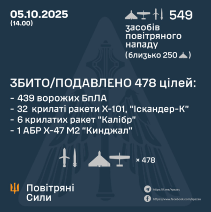 В течение ночи 4-5 октября страна-агрессорка Россия наносила комбинированный удар по территории Украины с применением ударных БПЛА, ракет воздушного, морского и наземного базирования. В общей сложности речь шла о 549 средствах воздушного нападения.