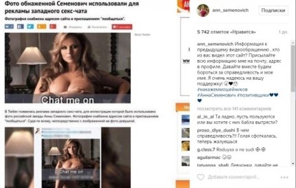 "Несколько дней назад в Интернете появилась информация о том, что мою фотографию из одного мужского журнала использует один европейский эротический сайт. Конечно, мне очень неприятно, потому что разрешения я им не давала. Мне приятно, с одной стороны, что я привлекаю мужчин не только в России, но и в Европе и что их сайт раскручивается за счет моей фотографии. Но что это такое — когда без моего ведома меня используют в целях рекламы, к тому же не очень интеллигентной. Я решила, что буду судиться с этим сайтом и надеюсь на вашу поддержку", - сказала Семенович.