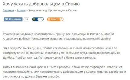 Журналист привёл открытое письмо президенту России Владимиру Путину, в котором Анатолий Ивачёв рассказывает, как взял крупную ссуду, но потом попал под сокращение и не может её выплатить. Россиянин также поясняет, что уже воевал в Чечне и на Донбассе, и готов поехать в Сирию, если это поможет ему оплатить долги.