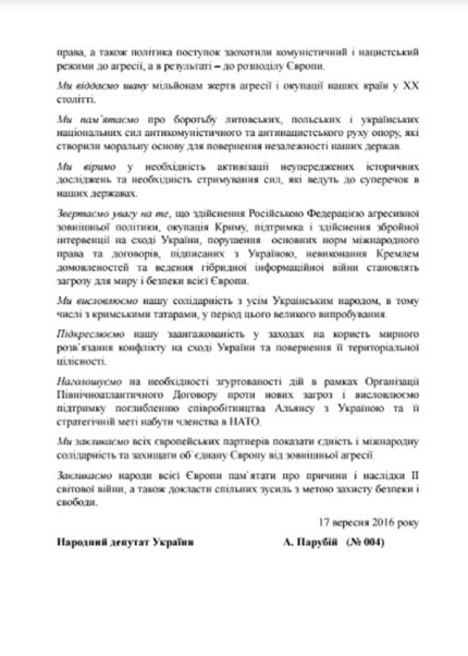 Парубий добавил, что эта декларация является ответом на российскую агрессию против Украины, Польши и всего западного мира.
