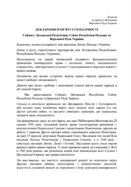 В документе подчеркивается, что Польша и Украина пережили трагедии из-за имперской политики России, в частности из-за пакта «Молотова-Риббентропа», который привел к началу Второй мировой войны и оккупации Польши нацистской Германией и Советским Союзом в сентябре 1939 года.