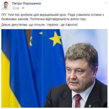 Президент Украины Петр Порошенко в своём Facebook выразил радость касательно утверждения последнего из законов.