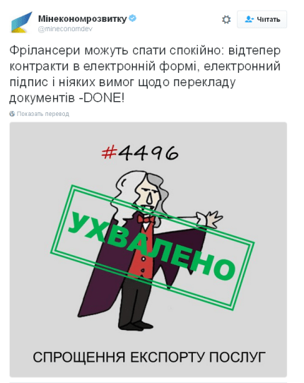 «Фрилансеры могут спать спокойно: теперь контракты в электронной форме, электронная подпись и никаких требований к переводу документов - сделано!» — порадовались в Twitter Министерства экономического развития Украины.