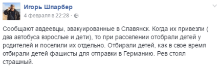 "Сообщают авдеевцы, эвакуированные в Славянск. Когда их привезли (два автобуса взрослые и дети), то при расселении отобрали детей у родителей и поселили их отдельно. Отбирали детей, как в свое время отбирали детей фашисты для отправки в Германию. Рев стоял страшный".