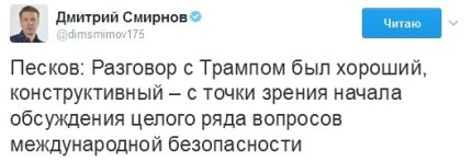 "Разговор с Трампом был хороший, конструктивный – с точки зрения начала обсуждения целого ряда вопросов международной безопасности", - добавил кремлевский спикер.