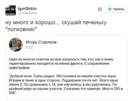 При этом проукраинский блогер в Twitter, пишущий под ником IgorGirkin, с иронией прокомментировал запись Стрелкова.