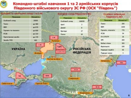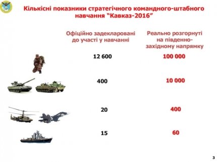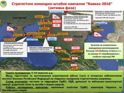 "Главным управлением разведки Министерства обороны Украины установлено, что под видом внезапной проверки боевой готовности ВС РФ, которая проводилась 25-31 августа с.г. и фактически стала начальным этапом "Кавказ-2016", Россия сосредоточила на юго-западном направлении межвидовое группировки войск (сил) численностью около 100 тыс. военнослужащих (в т.ч. около 41 тыс. у границ Украины), более 10 тыс. единиц военной техники, 60 кораблей и 400 самолетов и вертолетов. При этом более 11 тыс. военнослужащих были переброшены к Южного военного округа из других округов России", - сообщили в пресс-службе.