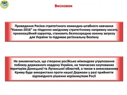 "Не исключается, что созданные российские межвидовые группировки вблизи государственной границы Украины, на временно оккупированных территориях Донецкой и Луганской областей, а также на территории аннексированного Крыма будут использованы против нашего государства в случае принятия соответствующего решения руководством России. Свидетельством этого является оставление российских войск на военных полигонах после официального завершения внезапной проверки. Аналогичное развитие ситуации наблюдалось во время вооруженной агрессии России против Грузии в 2008 году, накануне которой проводились учения "Кавказ-2008", - говорится в сообщении.