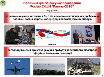 "За счет проведения учений "Кавказ-2016" российское руководство пытается достичь ряда политических целей как внутреннего, так и внешнего характера, а именно: отвлечь внимание населения России от социально-экономических проблем накануне парламентских выборов (18 сентября с.г.) на внешние военные угрозы для России; легализовать аннексию Крыма за счет прибытия официальных иностранных представителей на территорию полуострова", - заявили в ГУР.