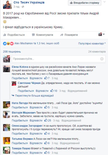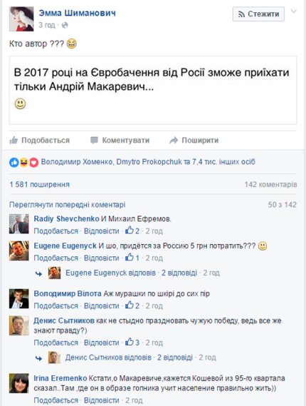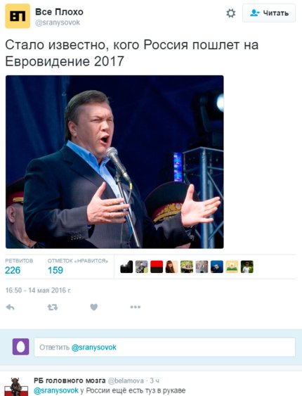 В частности, в 2017 году России предложили отправить в Украину Андрея Макаревича, поскольку больше никто и не поедет. Правда, тут же написали, что надо кого-либо другого, поскольку украинцы будут голосовать за него.